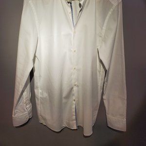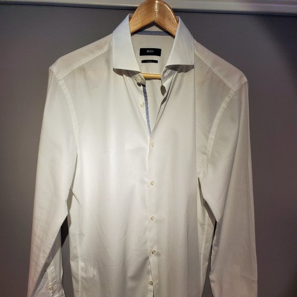 Hugo Boss - white button down shirt, regular cuff, blue piping . wrinkled in photo since just removed from vacuum sealed storage bag. appear to have slight discolor around collar. Size 16 slim fit.