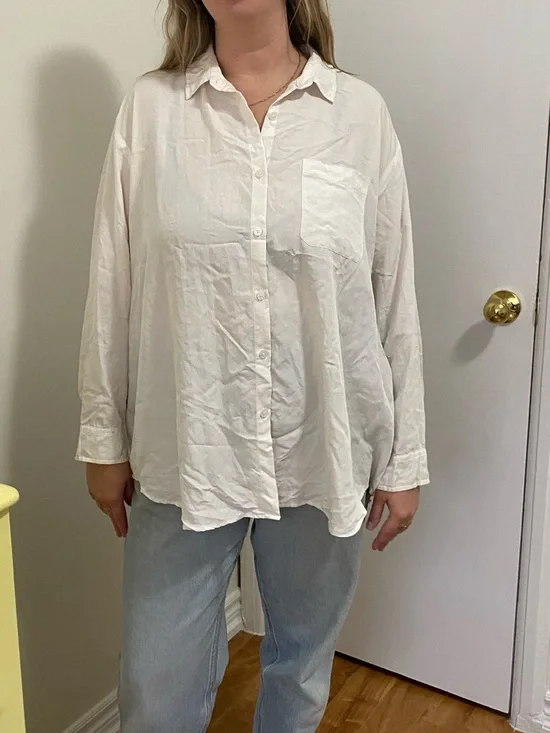 Classic white button-front blouse with a relaxed fit. Lightweight fabric offers all-day comfort. Collared neckline and single chest pocket for a polished look. Easy to pair with jeans or tailored pants for versatile styling. Too lazy to iron it! But when you wash it and hang it to dry and no wrinkles