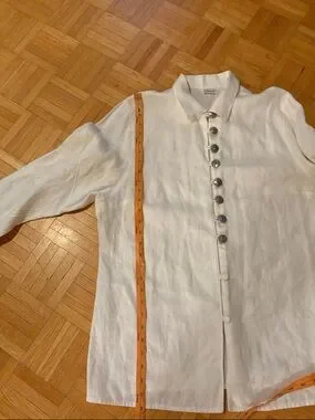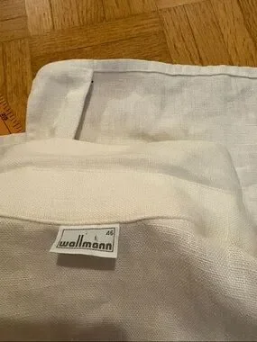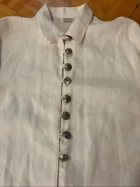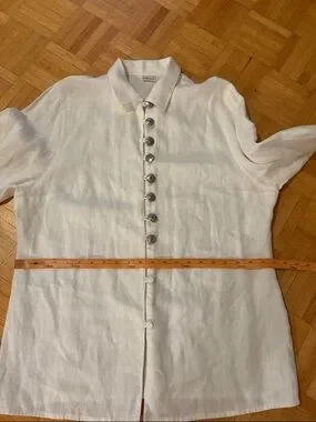 Lightweight white linen top with a classic button-front design. Breathable fabric ideal for warm-weather layering. Clean silhouette with subtle detailing for versatile styling. Easy to pair with casual or dressy outfits. Please check all photos Great condition specially for this age(imo) but you please check for your opinion, Never been dry cleaned, Needs to be refreshed from the storage (I think) Sold ASIS. Absolutely no Return if a buyer has any issues after receiving. Vintage Thick linen. Embroidery on sleeves