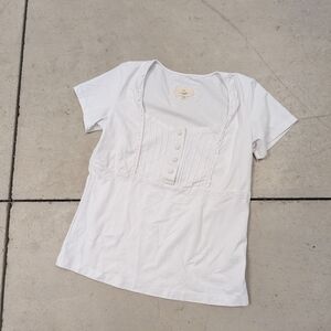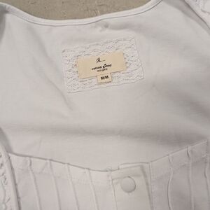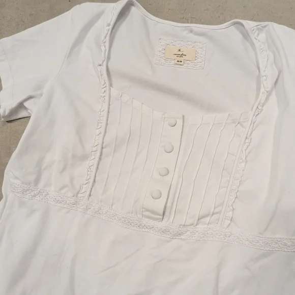 cotton Ginny, organic cotton Chic white top with button-front detail. Features elegant pleats and lace trim.