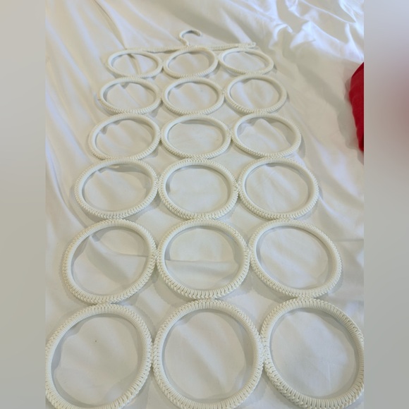 Elegant white circular hanging organizer. Ideal for organizing accessories. Perfect for hanging belts or scarves
