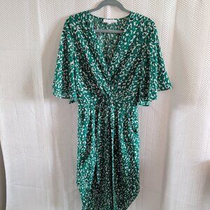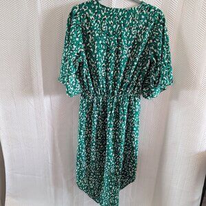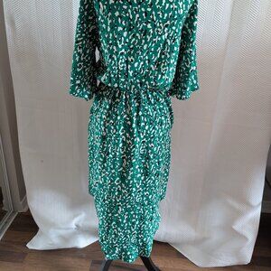 abstract dress, green patterned dress, midi length dress, tie waist, pockets, elastic back, casual glam, boutique style, comfortable fit, easy layering, White Closet brand, transitional piece, shower dress, date night, Artsy, Chic dress