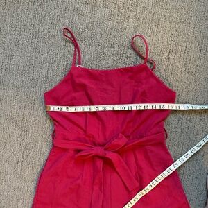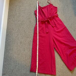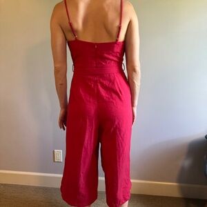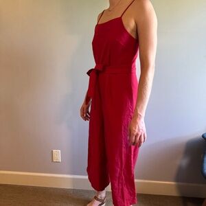 This red jumpsuit from the brand white closet is made of soft linen with a capris length pant. It has a self tie fabric belt. Size M. Australian Brand. Fits like a 6/8US.