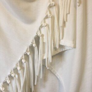 Very good preowned condition, white tassel-trimmed wrap cardigan. Has a slightly asymmetrical appearance as the tassels appear on only one side.