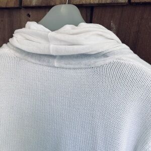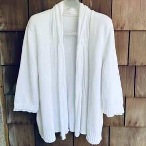 White cotton knitted cardigan with draped detail in front made of fine knit, 3/4 sleeves with double cuffs. In excellent condition.