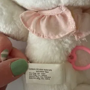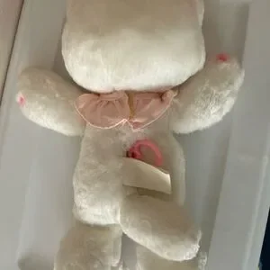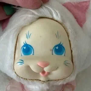 There are a few spots on the face and glue has let go around the edges but doesn’t affect function of the kitty. Has a cute little pink bib and a little bow on her head. She is absolutely adorable 🥰. See all photos for details and ask any questions, sold as is.