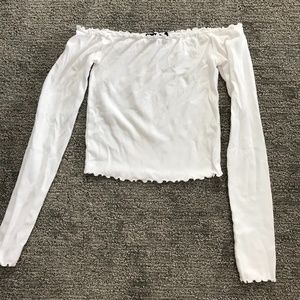Soft white long sleeve with ruffled edges. Neck and shoulder is a little tight.