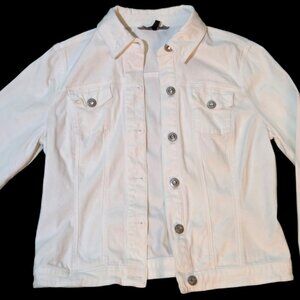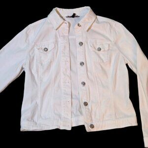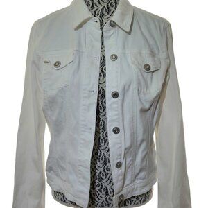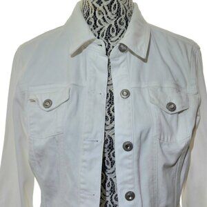 Classic and stylish white denim jacket from BACCINI, featuring a flattering fit and silver-tone buttons for a modern touch. Slight stretch for added comfort.