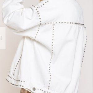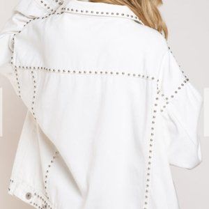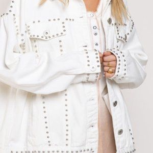 POL denim in white with silver studs. A must have for spring and summer. Designed in a relaxed oversized boyfriend fit with studded detailing throughout the garment. Very versatile jacket. Wear it anytime, for any occasion.