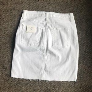 White denim mini skirt from Just Black. Two front and two back pockets, frayed bottom. Sits above knee.