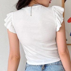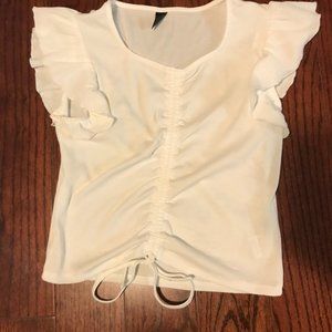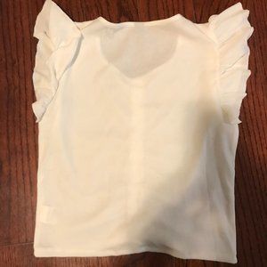 Colour in picture looks different because of lighting + shadow. White ruffled tee, never worn. Listed as medium to account for Asian sizing.