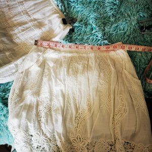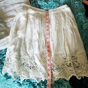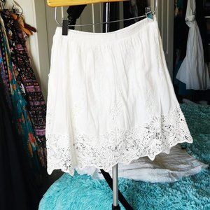 This cute white embroidered skirt is a lovely easy part of a summer outfit - basically, put whatever you like with it as it goes with everything! It also has pockets! Cotton, non stretch material, and an elastic waist.