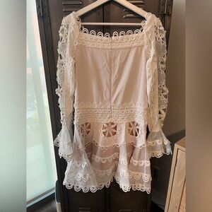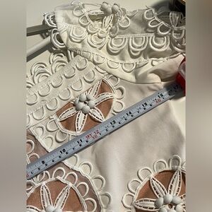 Elegant white dress with sheer panels, nude underlay. Intricate lace detailing adds sophistication. As seen as Adrienne Bailon! Never worn, in like new condition. Perfect statement, flirty dress. Measurements in pictures.