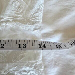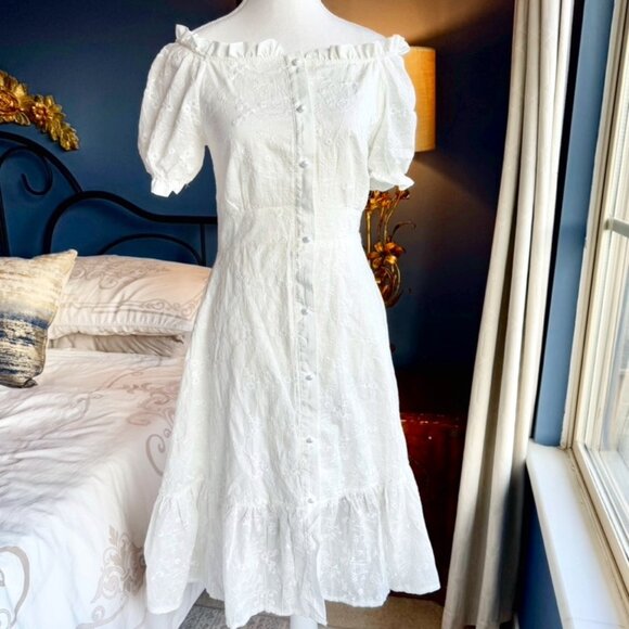 White eyelet off shoulder peasant midi dress, no tags other than one small "S". Feels like a cotton blend. Form fitting and super flattering, puff 3/4 off shoulder sleeves, faux button up front, zips up back, lined. Great used condition. Bust measures 15 inches laying flat, waist 14 inches flat, hips 20 inches, length from shoulder to hem is 42.5 inches. Cat friendly, nonsmoking home.