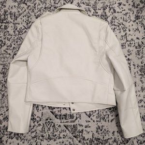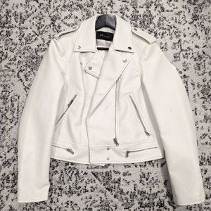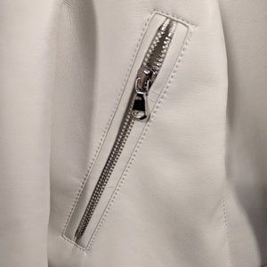 White Faux Leather Jacket – This jacket rocks a sleek white look that goes with anything – whether you're hitting the town or just doing your casual thing. The cut out lapel gives it that extra edge, and the zippered pockets are both handy and stylish. Versatile enough for any occasion! Throw it on over a sleek black dress for an instant chic vibe, or pair it with your favourite jeans and a tee for that effortlessly cool look. The jacket sits just below the waist. Size: M Brand: Deluc Outer Shell: 100% PU Lining: 100% Polyester