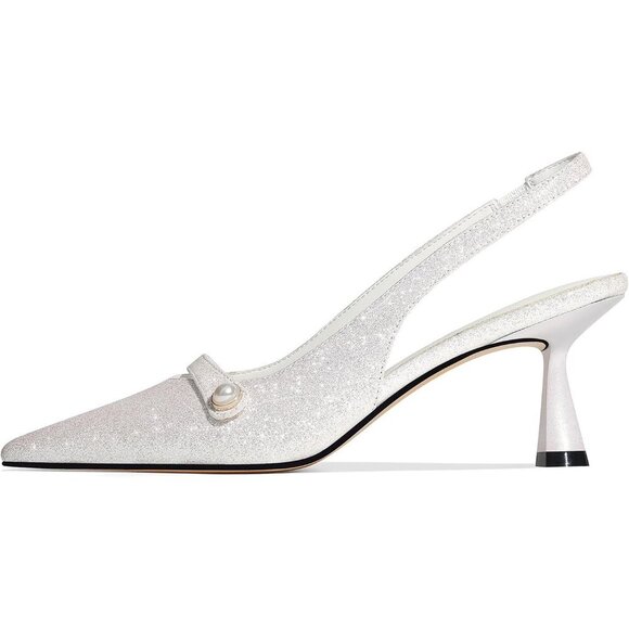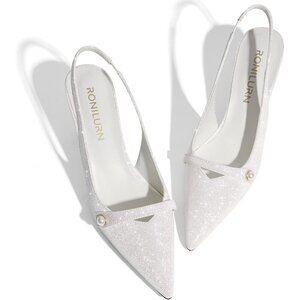 🆕White Faux Leather Kitten Heels Slingback Pumps, Pearl Heels for Work/Wedding