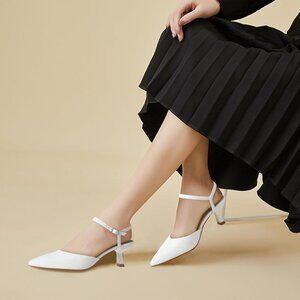 🆕White Faux Leather Women Pumps Pointed Toe Kitten Heels Ankle Strap Wedding