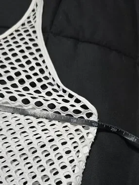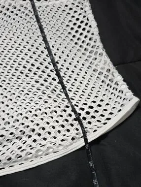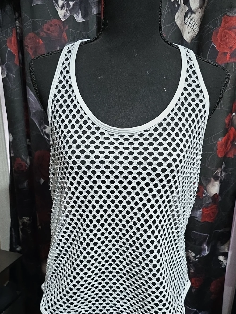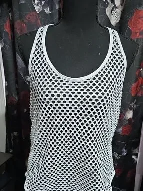 White open-knit fishnet tank top for breathable layering. Soft stretch trim at the neckline and armholes for comfortable wear. Lightweight and versatile white color pairs easily with casual outfits and beach looks.