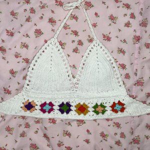 White handmade crochet bralette with with multi-coloured floral design. Fits S-M