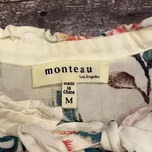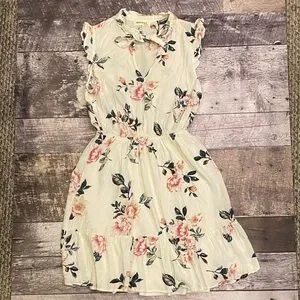 Elegant dress with floral print. Features ruffled sleeves and tiered skirt.