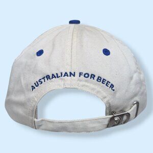 This baseball cap by Foster's is made of 100% cotton and is white with blue accents. The hat has an embroidered logo on the front in yellow, blue, red and white, and says, "FOSTER'S" along the left side of the brim. The back says, "AUSTRALIAN FOR BEER" above the hole and the size of the hat can be adjusted with the strap. The silver piece keeping the strap in place can also be used as a bottle opener. There is normal wear, including some possible tone imperfections from time and use, but no issues affecting wearability.