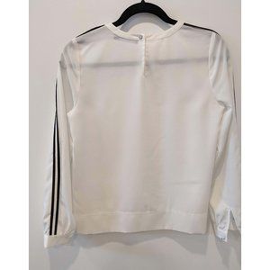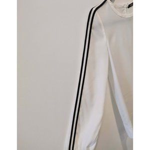 Dress up or down this elegant white top. Two stripes detail going down the sleeve with buttons at the wrists.