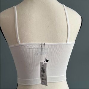 features: white, ribbed, stretchy, bra, crop top with V-neckline and spaghetti straps (straps are NOT adjustable)