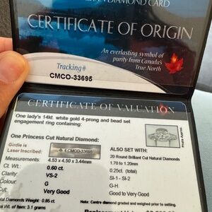 • centre diamond: princess cut 0.6 carat, mined in Northwest Territories. Colour G, clarity VS2, cut very good
