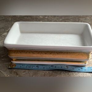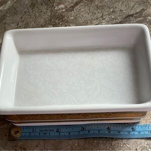 Elegant soap dish with decorative metallic pattern around sides of the dish.