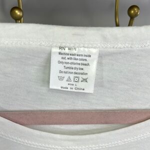 Stylish white graphic t-shirt featuring bold red and black text. Perfect for casual wear.