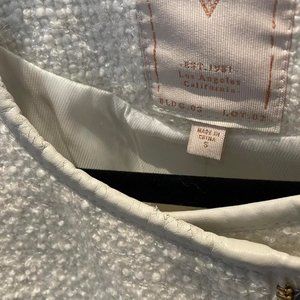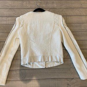 White faux leather and tweed with sequins and zippers. Unworn. The faux-leather around neckline is beginning to crack due to age, as shown in the image provided. No other found damage.