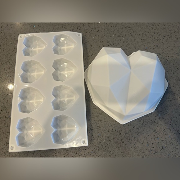 Heart-shaped silicone mold in white. Perfect for baking or crafting. Large and small ones
