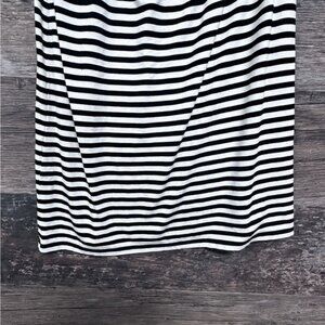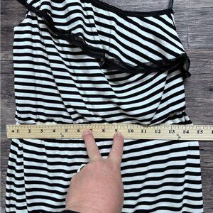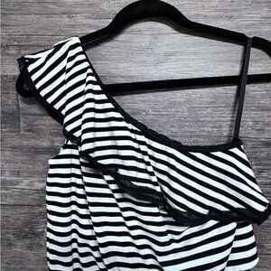 Stylish one shoulder dress. Black and white stripes. Ruffle detail on neckline. Perfect for any occasion.