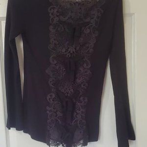 I would describe this black bow sweater from White House Black Market as work-chic and goth-chic. It has black lace on the front around the collar bone and four black bows with lace surrounding them on the back. It is slightly a-symmetrical in the back as one piece of fabric is ever so slightly longer than the rest. Price is negotiable.