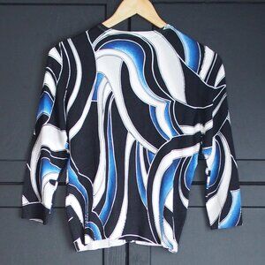 This is a beautiful cardigan with its shimmery sliver highlights throughout and its next-level buttons as in description! This would wear well for a chic business top with either a skirt or dress pants.