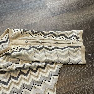 White House Black Market XS Blouse Top with a boat style neckline. Buttons and peek a boo slots on short sleeves. Wide sleeve. Metallic chevron pattern. Rayon blend. Great condition. Features fasteners inside top to keep bra or tank top in place. See pictures.