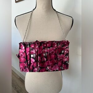 Elegant floral pink clutch bag with a stylish chain strap. Perfect for adding a pop of color to any outfit.