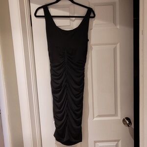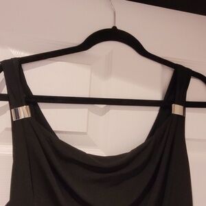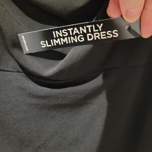 WHBM Brand New With Tags Instantly Slimming Black Dress. Zips in back and has silver-tone metallic accents at front shoulders. Material and measurements in pictures. It is lined with shapewear almost like Spanx to hold everything into place.