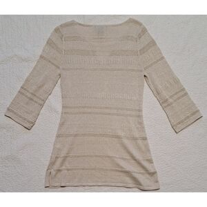 Sumptuous, metallic-infused sweater in a long, lean silhouette combines a French bateau neckline with woven artisanal accents. Detailed with side slits, open stitching and slightly belled sleeves for a hippie-chic touch.