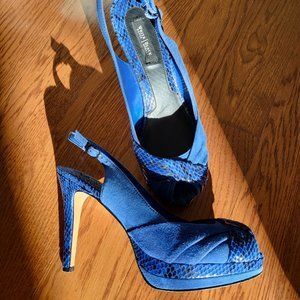 White House Black Market platform blue heels. Combination of suede and embossed leather. Leather soles. Size 8 Medium. Gently used. Elegant and bold in the same time. Heel height: 110mm. Platform height: 25mm