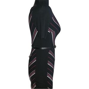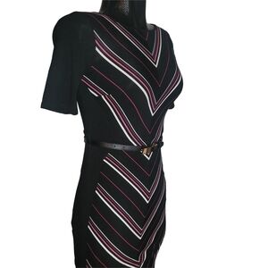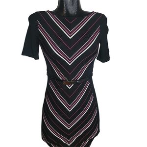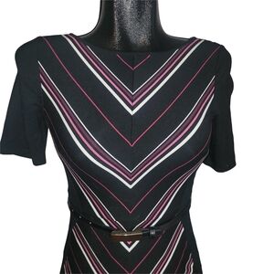 This elegant black dress features a striking pink, purple and white chevron pattern, perfect for any occasion. The short sleeves and fitted design offer a flattering silhouette. Ideal for both casual and formal events. Has a hidden back zipper closure and comes with a belt.