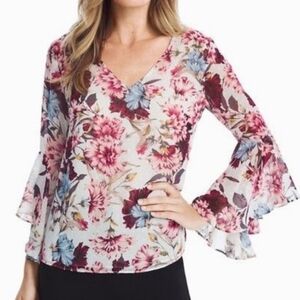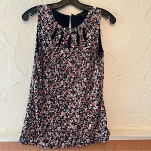 This is a sleeveless floral tank top from White House black market. The top has a notched style opening in the front with a chain closure. The front bodice has layering, which is very slimming and flattering. A photo of the layering is attached in the photographs. This top is lined in black And is 95% polyester and 5% spandex so it has some stretch. The shape of the tank is also very flattering as it curves in towards your waist. This item is wrinkle resistant as well is a pull over.
