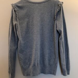 Stylish gray sweater with 'Loved' print. Features ruffled shoulder details. Perfect for casual wear.