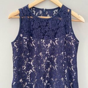 White House/Black Market Navy Blue Lace Mesh Overlay Sheath Lay Below Knee Dress