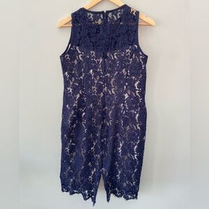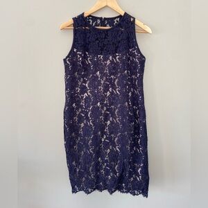White House/Black Market Navy Blue Lace Mesh Overlay Sheath Lay Below Knee Dress