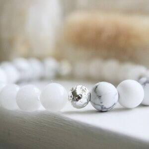 This particular bracelet is made of White Jade, White Howlite and Silver Lava beads (for your essential oils). Fits wrist size of 6.5"-7.5"