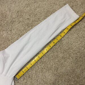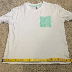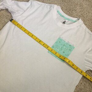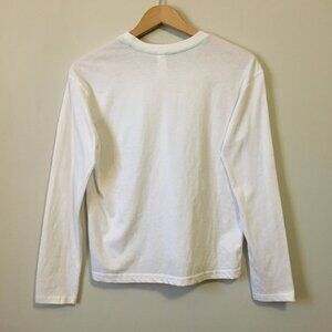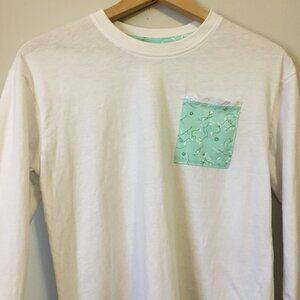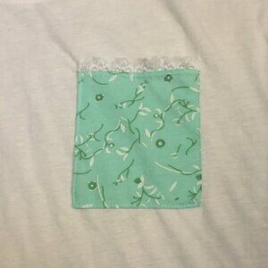 Very good preowned condition, white, long sleeved jersey top by Under Disguise with a pop or colour at the left breast pocket. Pocket is a minty green with a ditsy floral pattern in white and dark green. Simple and sweet.
