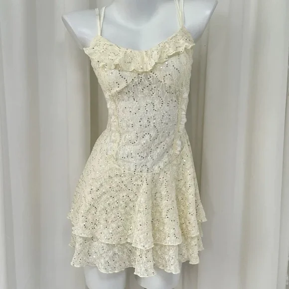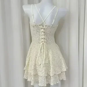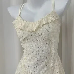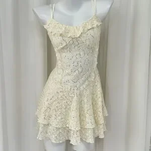 Elegant white lace dress with ruffle details. Perfect for special occasions.