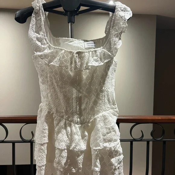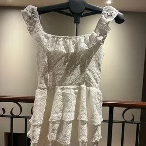 Elegant white lace dress with ruffle details. Perfect for special occasions.