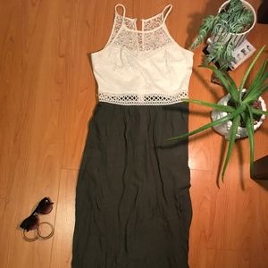 This flowy green maxi dress has a delicate white lace top with a see-trough part in the waist that zips and buttons in the back. There is a leg slit for the left leg and is a long elegant length to the feet (and I’m 5’6’’)